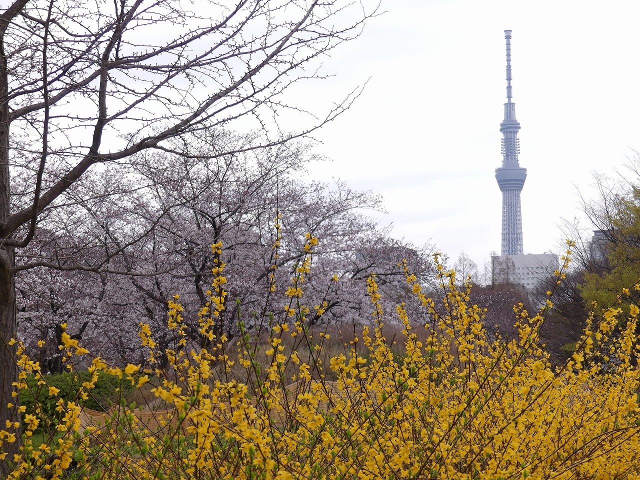 レンギョウとスカイツリー